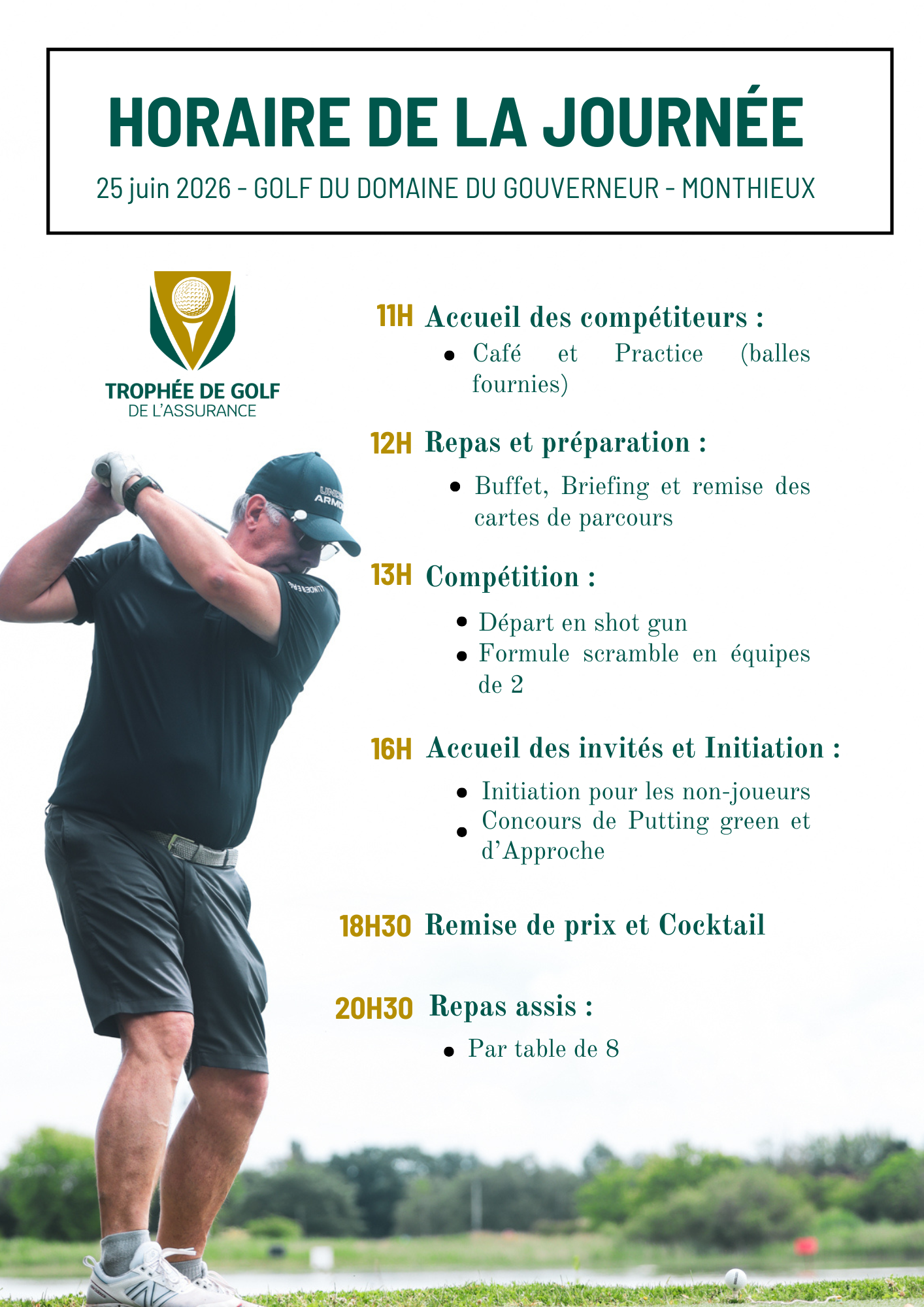 Lieu de l’événement : Golf du Gouverneur Lieu-dit, Le Breuil, 01390 Monthieux Date : La 37ème édition du Trophée de Golf de l’Assurance aura lieu le jeudi 25 juin 2026.